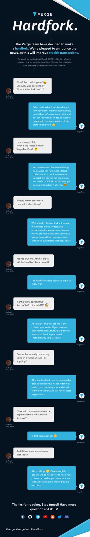 After unsuccessfully trying to resolve some of the incomplete stealth transactions via a soft fork Verge (XVG) has announced an upcoming hard fork. It is necessary to reconcile the ongoing issues and get all of the miners on the same page. Stealth transactions are one of the biggest features of XVG, this allows them to ensure the privacy of their user when sending transactions.